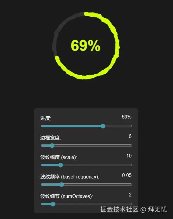 feTurbulence的baseFrequency(波纹的频率)和feDisplacementMap的scale(波纹的幅度),让用户可以自由定制喜欢的效果。