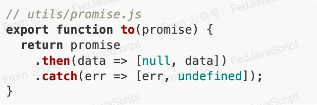 我们可以将这种思想引入到 JavaScript 的 async/await 中。创建一个辅助函数(我们称之为 to),它接收一个 Promise作为参数,并且永远不会被 reject。相反,它总是 resolve 一个数组,格式为 [error, data]。