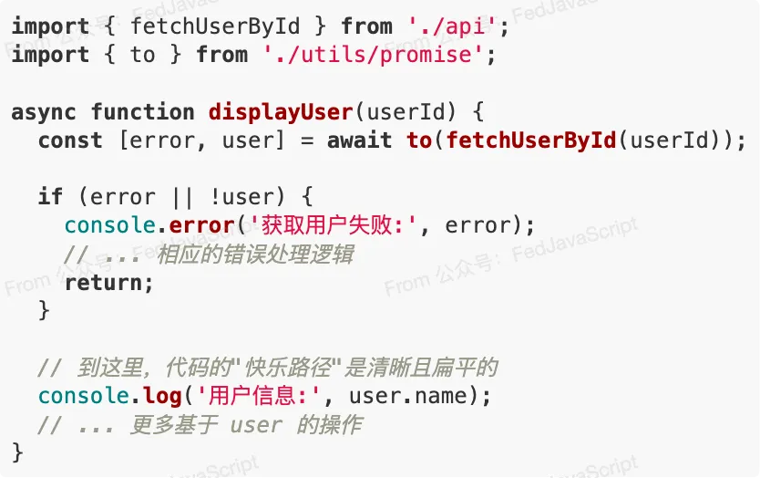 const [error, data]迫使开发者正视error的存在,不容易遗漏错误处理。 - 关注点分离:通过卫语句将错误处理逻辑与成功逻辑分离开,代码更易于维护。